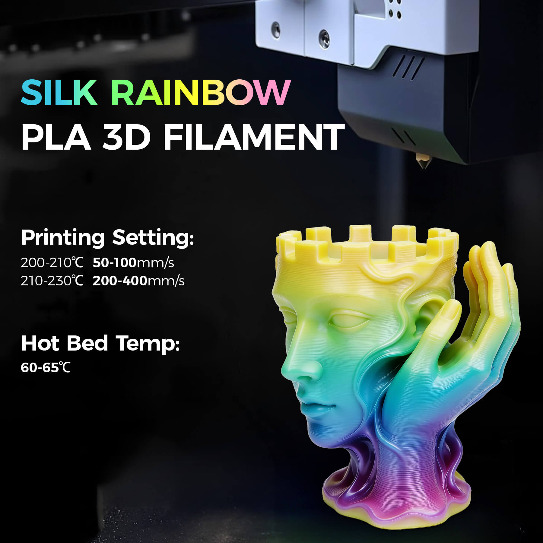 【Silk Filament Recommended Settings】For optimal results with Dual&Triple color Rainbow Silk Filament, we recommend a nozzle temperature of 200-230°C, a bed temperature of 60-65°C, and a print speed of 50-400mm/s.