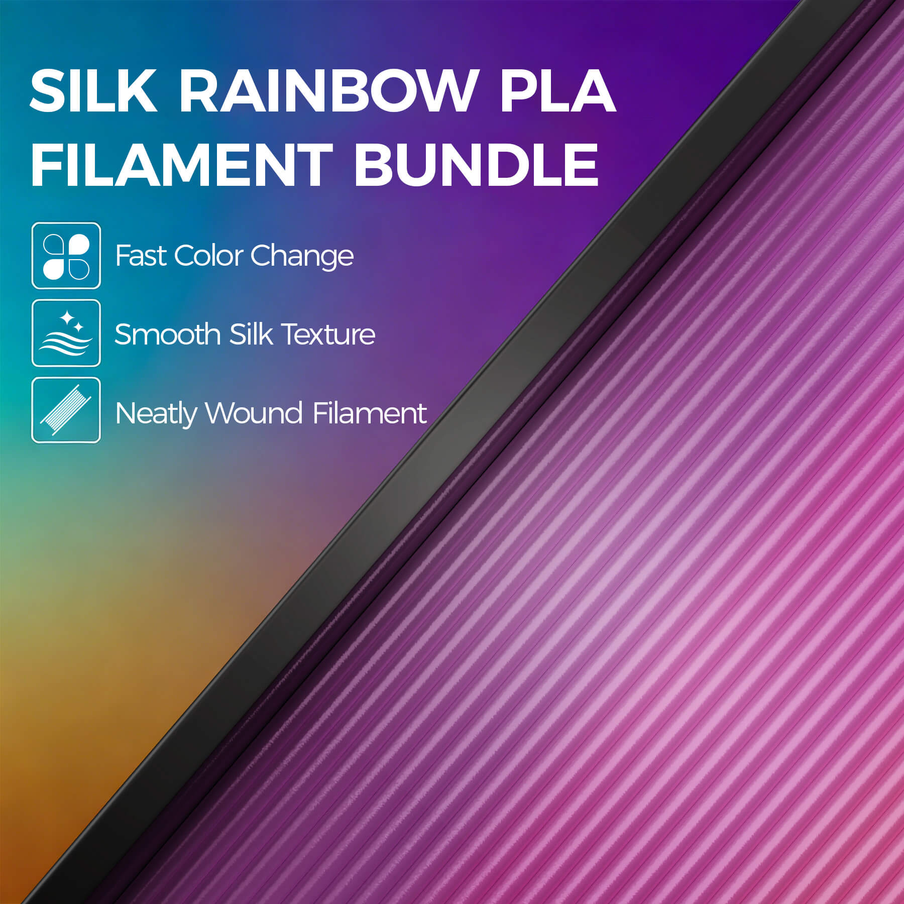 【Silk Rainbow PLA Filament Note】The colors may change with each roll of Silk Rainbow Filament, so the initial color of each roll may differ from the image, but the overall color composition remains consistent.